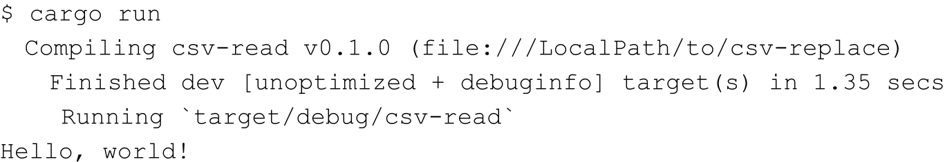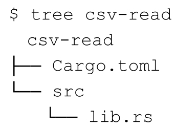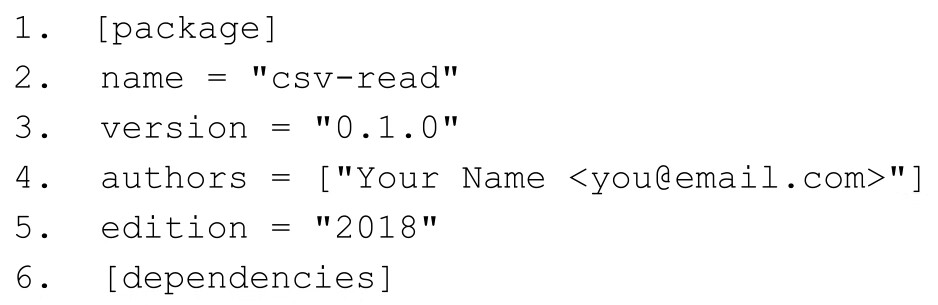 代码清单10-1展示了Cargo.toml文件的内容(manifest文件),它里面记录了用于编译整个包所用到的元数据。代码第1~5行定义的是包信息,记录了包的名字为“csv-read”。