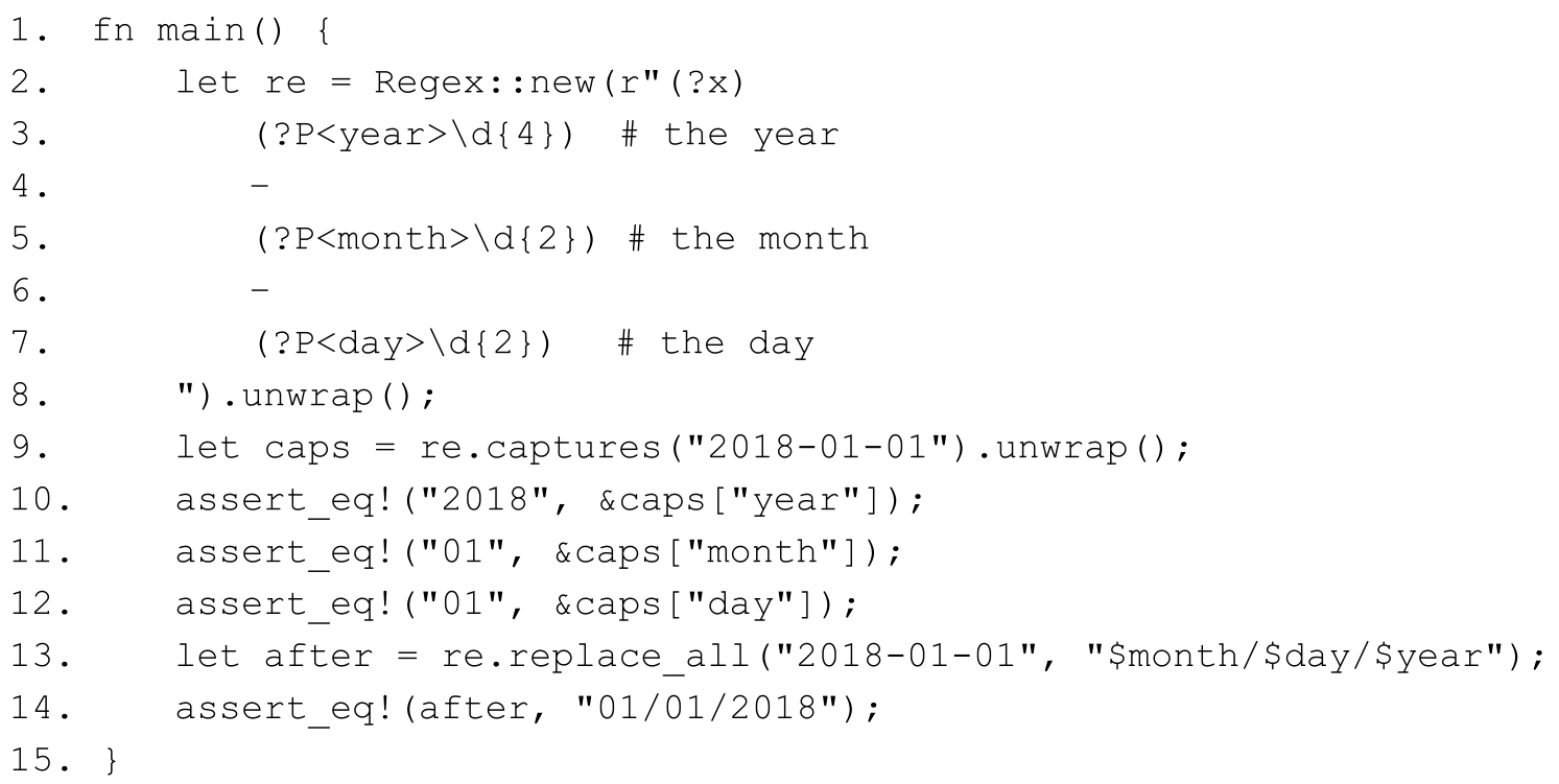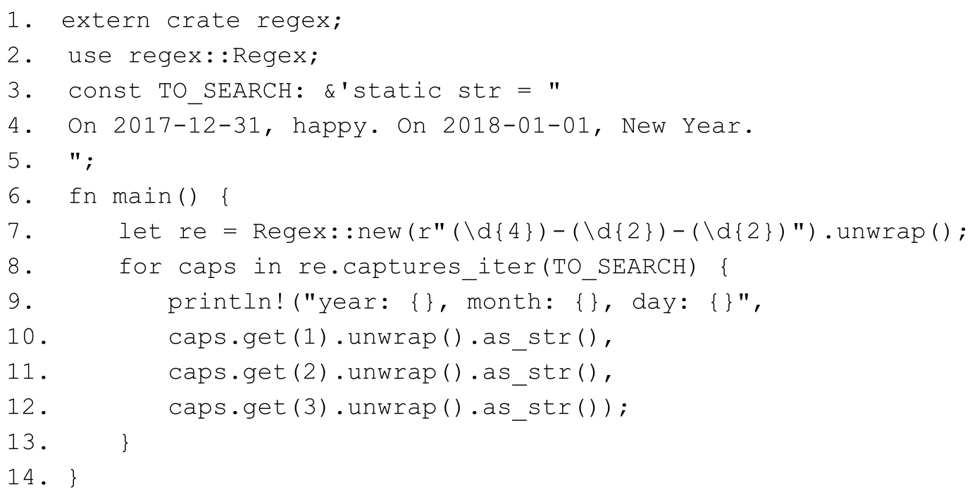 当前regex最新的版本是1.0.5。然后,在src/main.rs中同样使用extern crate来声明引入regex包,如代码清单10-7所示。