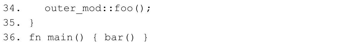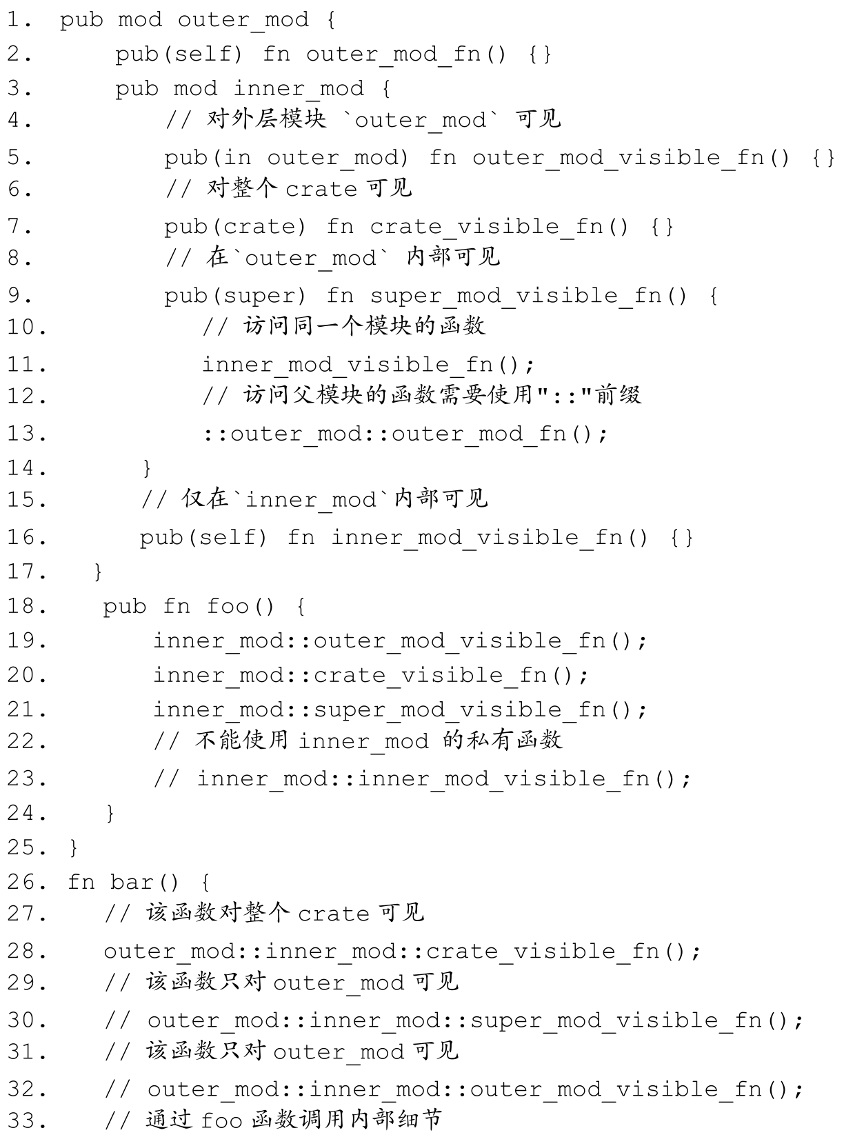 代码第26~35行,在顶层模块中定义了bar函数。其中调用了在outer_mod中定义的函数——只有对整个crate可见的crate_visible_fn函数,以及对顶层模块可见的foo函数;而另外两个函数则无法在外层模块中被调用。