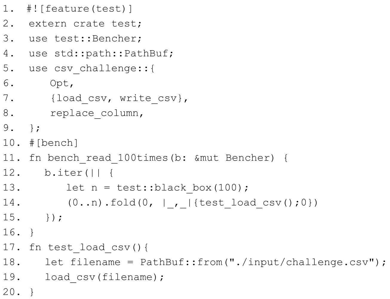 代码第11~16行,创建bench_read_100times函数,使用#[bench]属性对其标注,表示这是一个基准测试函数。在iter方法的闭包参数中,使用test::black_box(100)来确保调用test_load_csv函数100次不受编译器优化的影响,可以较为准确地测出load_csv函数的性能。然后用fold方法调用test_load_csv函数100次,如代码第14行所示。