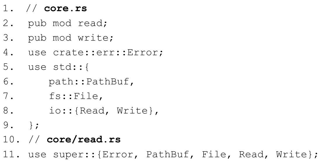 在代码清单10-54中,将在core/read.rs中引入的std模块都移出来,此处使用了Rust 2018新模块系统支持的use语句内嵌语法。在修改core.rs的同时,也需要修改core/read.rs,通过super前缀从父模块中引入要使用的类型。