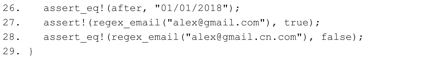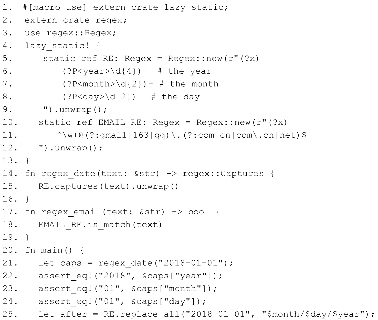 代码第4~13行,使用lazy_static!宏定义了两个全局静态变量RE和EMAIL_RE,它们是不同的正则表达式。这样一来,就只需要编译一次,而不会重复编译。之所以把正则表达式定义为全局静态变量,是出于编译性能的考虑,如果该正则表达式被用于循环匹配中,那么会降低编译的性能,并且不利于正则表达式引擎内部的优化。