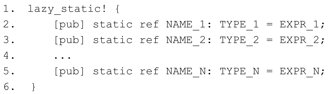 在使用lazy_static!宏时,必须严格按照此语法格式来书写,否则会引发线程恐慌。