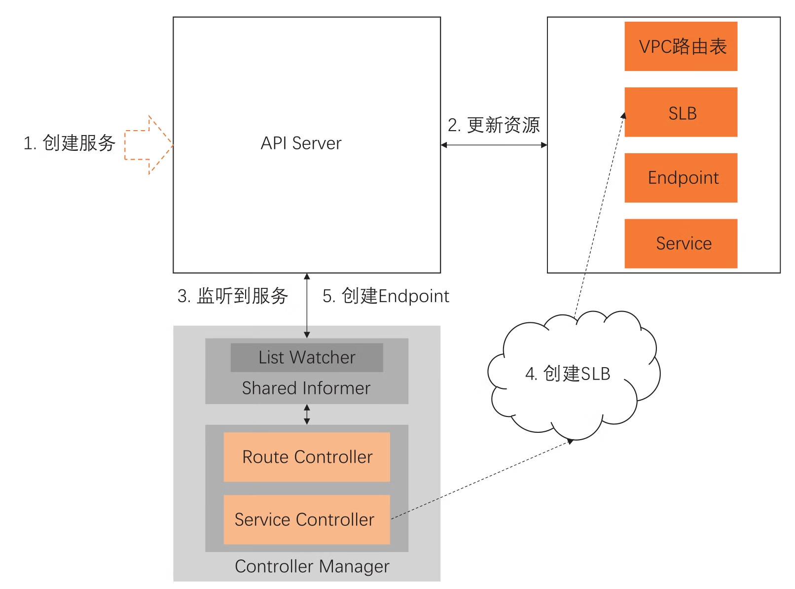 最后,服务控制器理解Load Balancer类型的服务。因为这类服务除了存放在Etcd内的服务资源外,还需要一个SLB作为入口,和若干Endpoint作为后端。所以服务控制器会分别请求云接口和API Server来创建SLB实例和Endpoint资源,如图2-9所示。