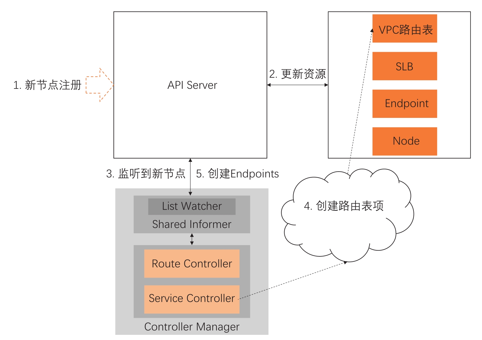 如图2-10所示,当一个新节点被加入集群的时候,集群需要在VPC路由表里增加一条路由项,来搭建这个新加节点的Pod网络主干道。
