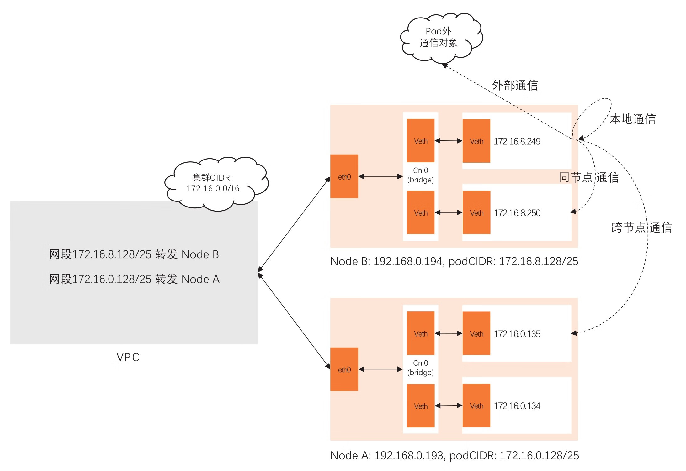 同节点Pod之间的通信,是Cni0虚拟网桥内部的通信,相当于一个二层局域网内部设备通信。