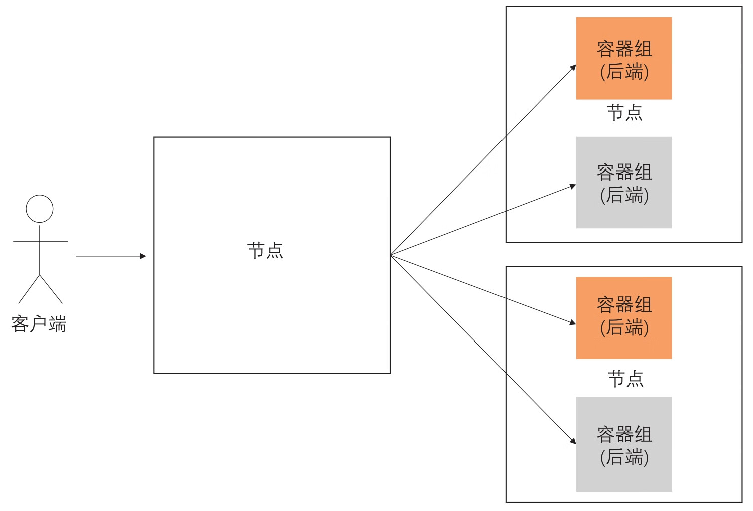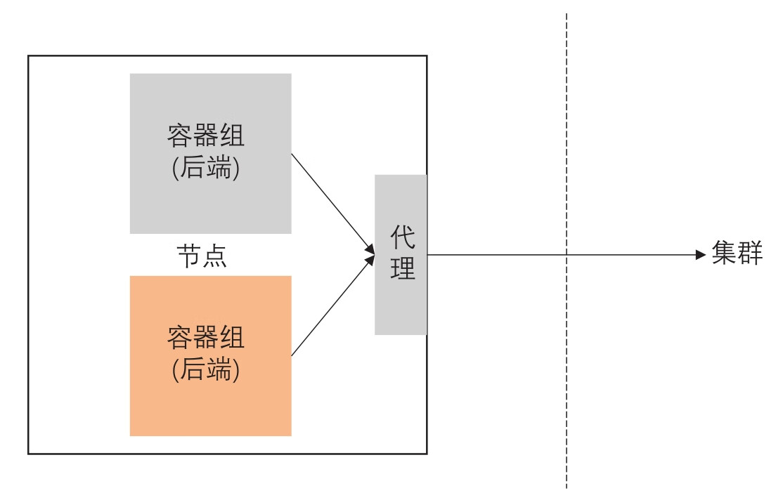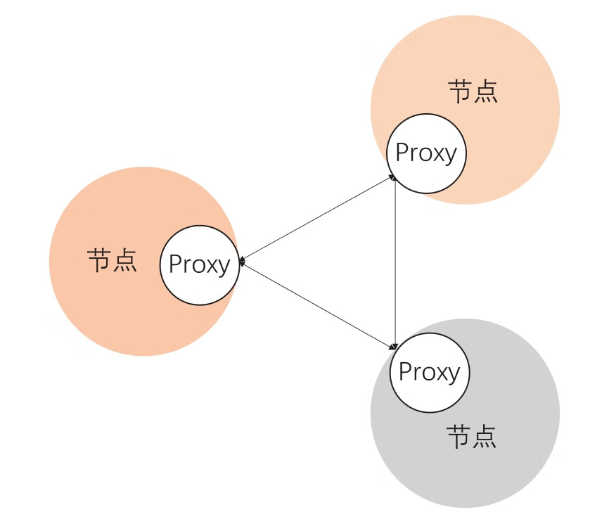 在Kubernetes集群中,服务的实现实际上是为每一个集群节点部署了一个反向代理sidecar。而所有对集群服务的访问,都会被节点上的反向代理转换成对服务后端容器组的访问。基本上,节点和这些sidecar的关系如图6-4所示。