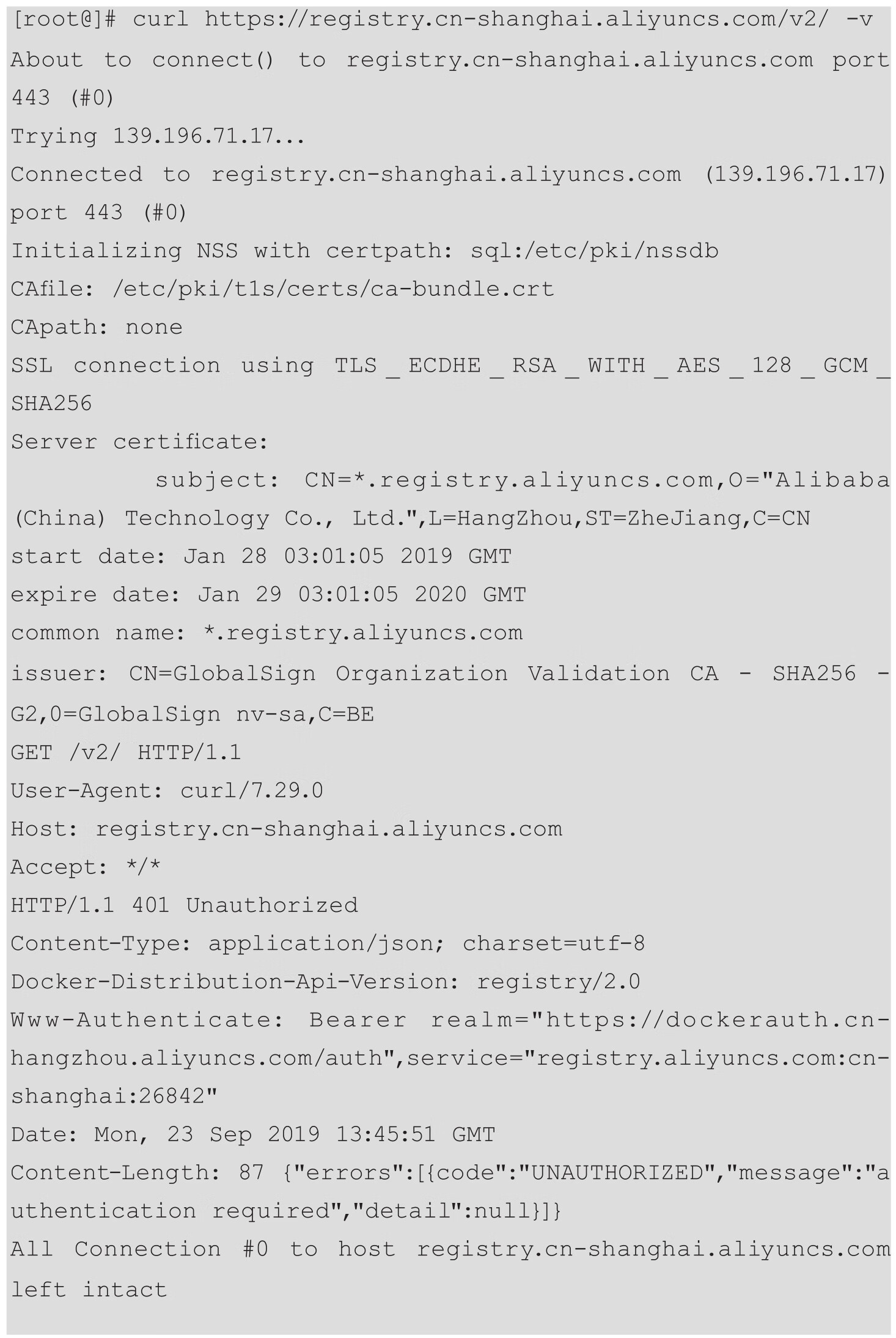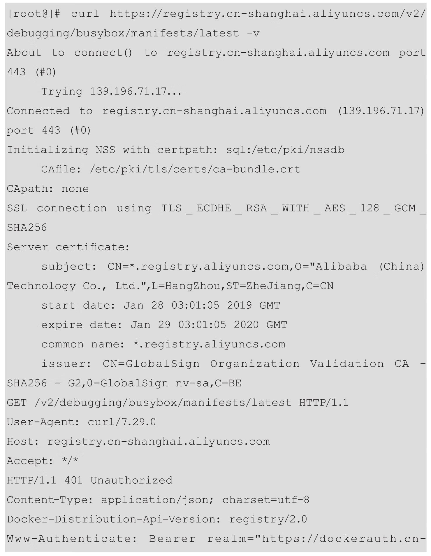 第二件事情,docker访问镜像仓库的HTTPS地址,并通过挑战v2接口来确认接口是否会返回Docker-Distribution-Api-Version头字段。这件事情在图8-6中没有对应的步骤,它的作用跟ping差不多,只是确认一下v2镜像仓库是否在线,以及版本是否匹配。