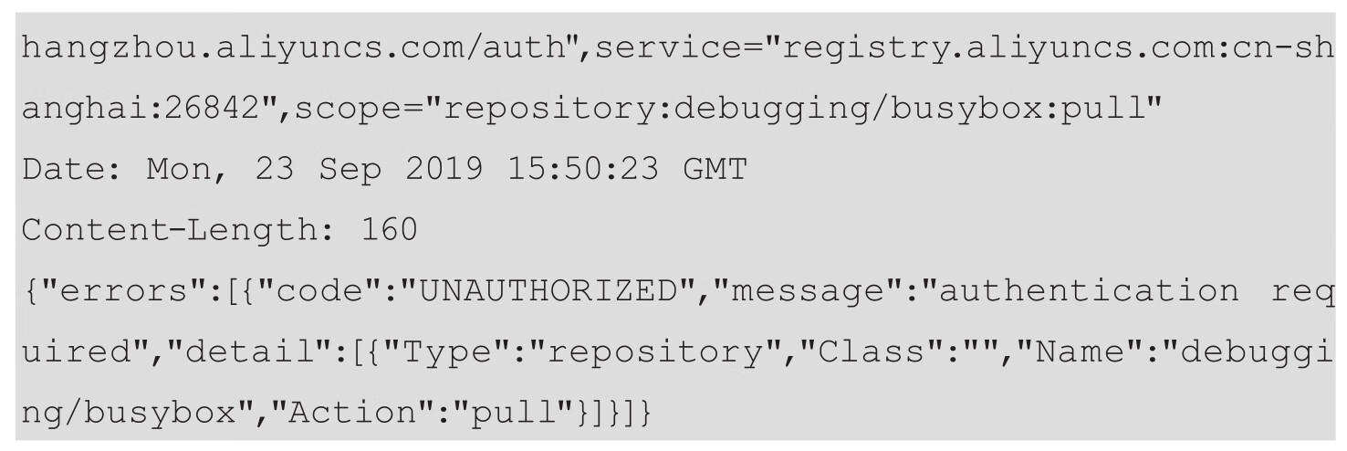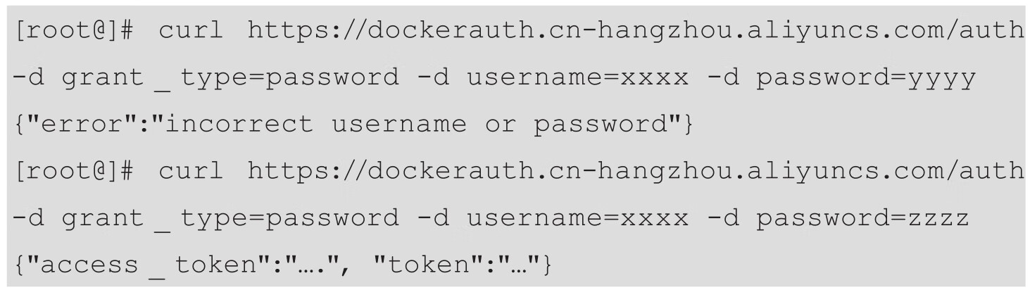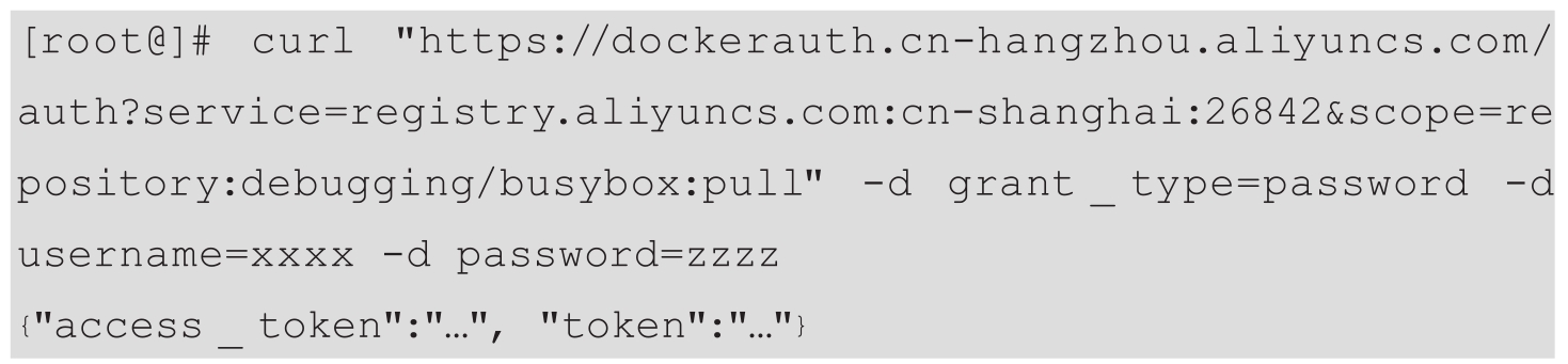 接着,docker访问上面拿到的Bearer realm地址来鉴权,并在鉴权之后获取一个临时的Token。这对应着图8-6中使用用户名和密码获取临时Token这一步,使用的用户名和密码直接读取自docker.json文件。