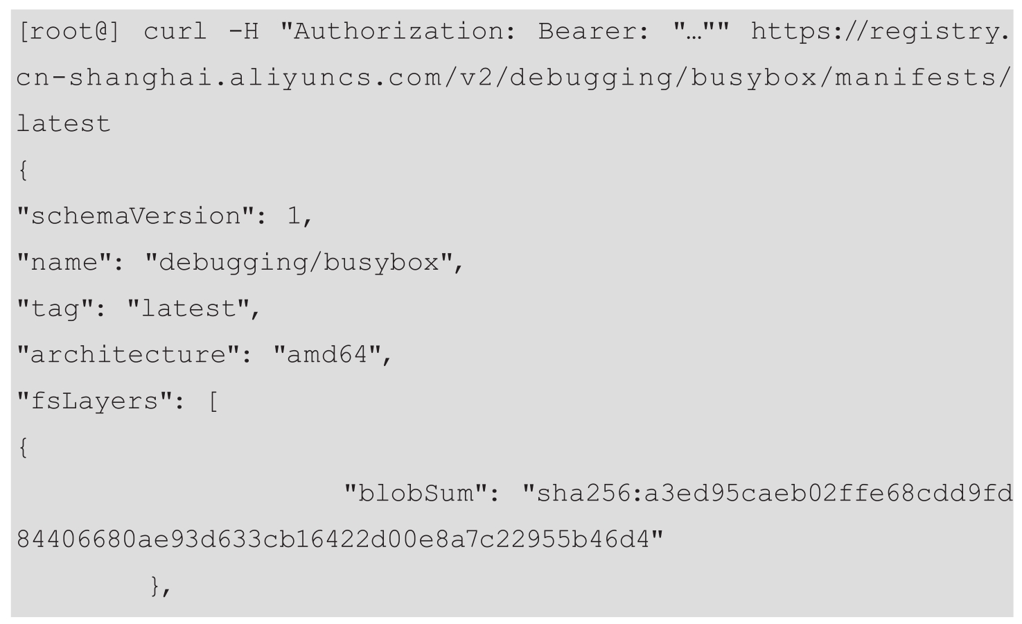 最后,使用上面的Token,以Authorization头字段的方式下载manifests文件。这对应的是图8-6中下载资源这一步。当然因为镜像还有分层文件,所以实际上docker还会用这个临时Token多次下载文件才能实现完整的镜像下载。