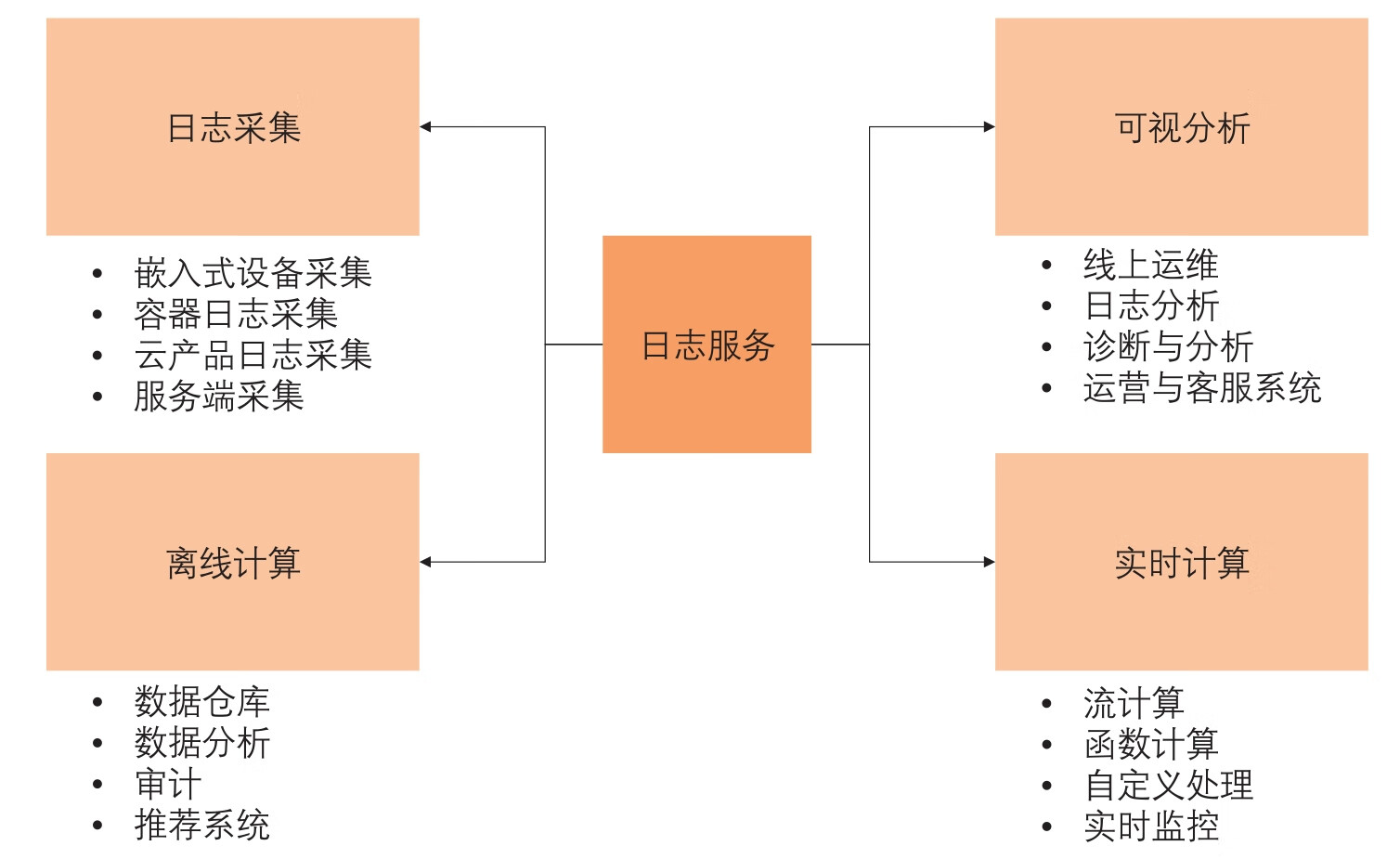 从功能角度来看,日志服务主要包括日志采集、离线计算、可视分析以及实时计算等,如图9-1所示。