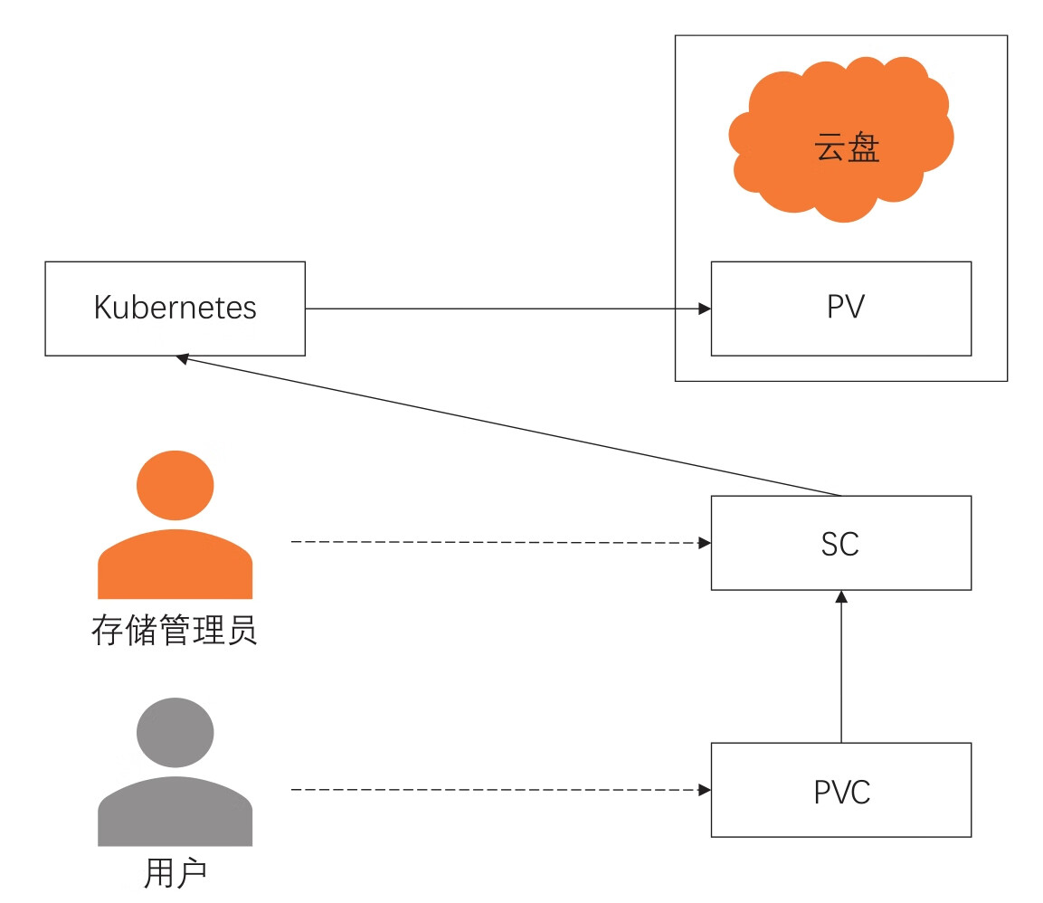 (2)通过SC按需动态分配方式:SC用于声明动态申请的存储Volume将由哪种Volume Plugin创建、创建时的参数,还可以从其他功能性和非功能性角度进行描述。这种方式可按需动态分配,使用起来比较灵活,在Kubernetes中比较常用,如图10-2所示。