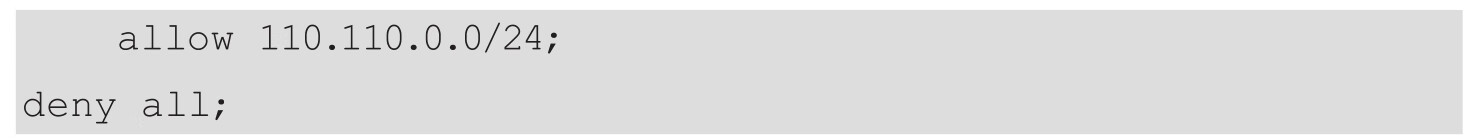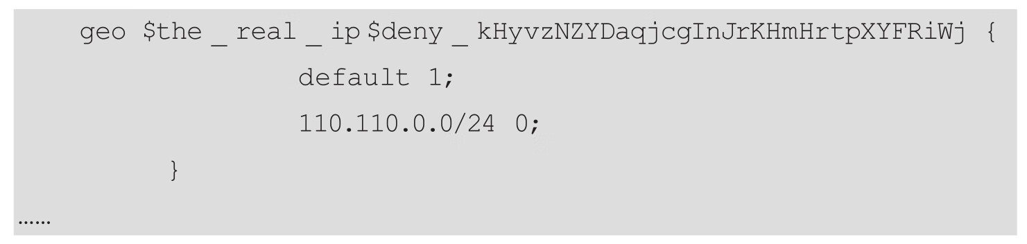 $the_real_ip如果落在110.110.0.0/24中,则放行(0),否则进入“default”,即拒绝(1)。可以通过查看Ingress-nginx的配置文件来确认白名单是否配置成功,配置文件路径为/etc/nginx/nginx.conf。