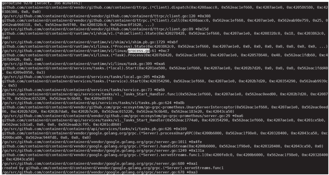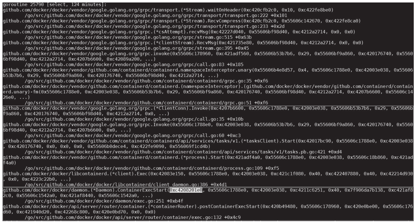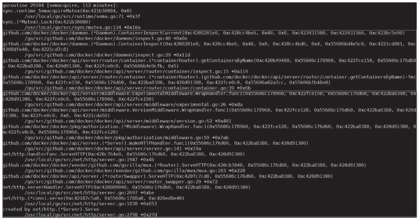 在这个问题中,既然PLEG认为容器运行时出了问题,我们就需要从docker daemon进程看起。我们可以使用kill-USR1<pid>命令发送USR1信号给docker daemon,而docker daemon收到信号之后,会把所有线程调用栈输出到/var/run/docker文件夹里。