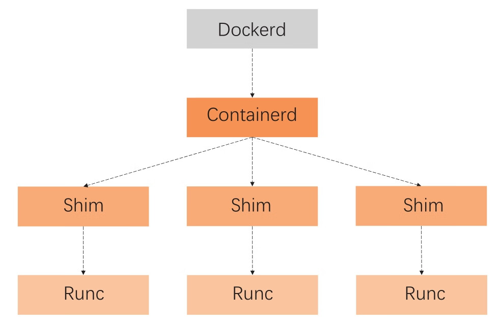 Docker作为阿里云Kubernetes集群使用的容器运行时,在1.11版之后,被拆分成了多个组件以适应OCI标准。拆分之后,其包括docker daemon、containerd、containerd-shim和runC。组件containerd负责集群节点上容器的生命周期管理,并向上为docker daemon提供gRPC接口,如图13-5所示。
