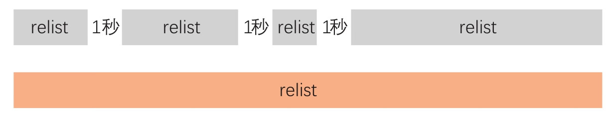 而我们之所以观察到节点会在重启Kubelet之后处于就绪状态3分钟,是因为Kubelet重启之后第一次PLEG检查操作就没有顺利结束,节点就绪直到3分钟超时之后才被同步到集群中。如图14-4所示,上面一行表示正常情况下PLEG的执行流程,下面一行则表示有问题的情况。relist是检查的主函数。