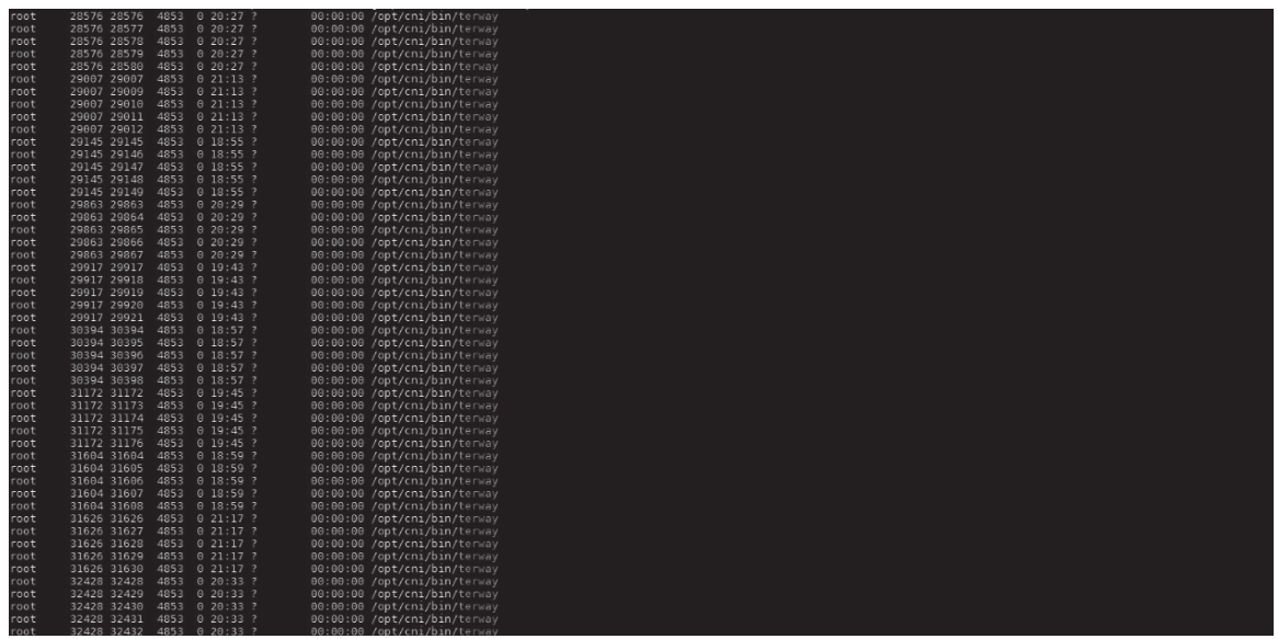 而在上一节最后我们看到的问题是,Kubelet调用CNI Terway去配置Pod网络的时候,Terway长时间无响应。正常情况下这个操作应该是秒级的,非常快速。而出问题的时候,Terway没有正常完成任务,因而我们在集群节点上看到大量Terway进程堆积,如图14-6所示。