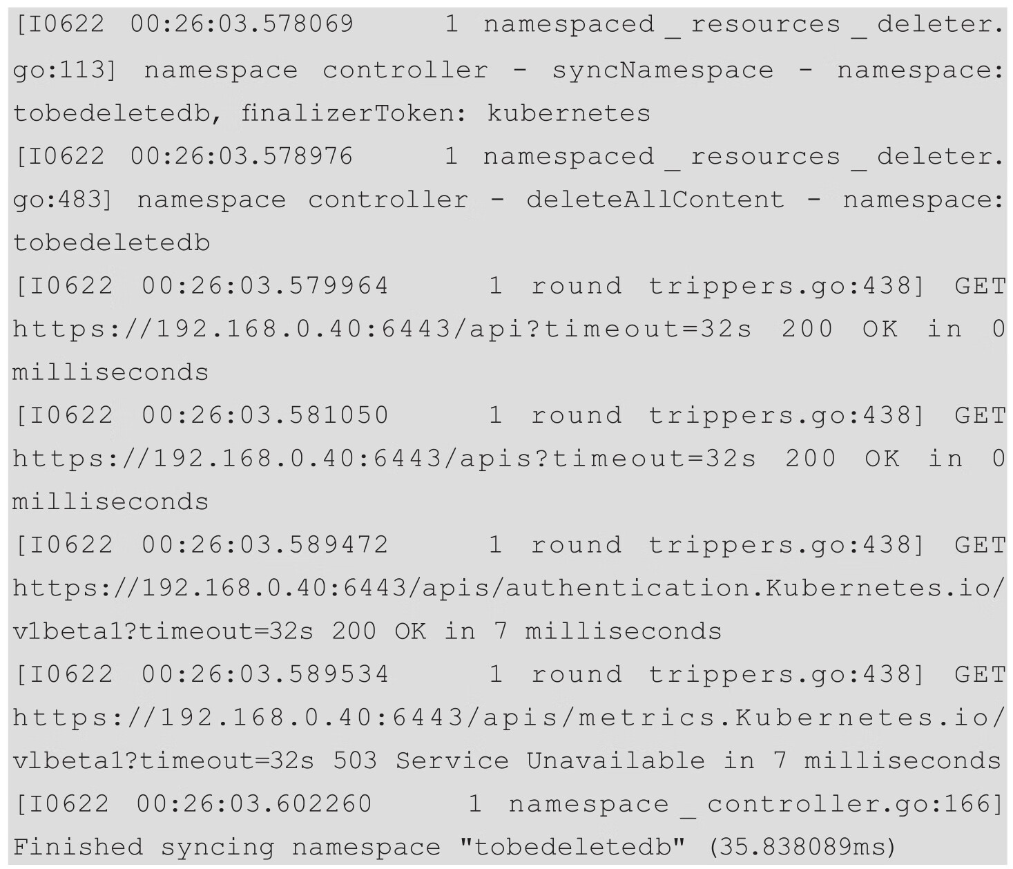 和上一节类似,我们通过开启Kube Controller Manager最高级别日志,来研究这个组件的行为。在Kube Controller Manager的日志里,可以看到命名空间控制器在不断地尝试一个失败的操作,就是清理tobedeletedb这个命名空间里“收纳”的资源。