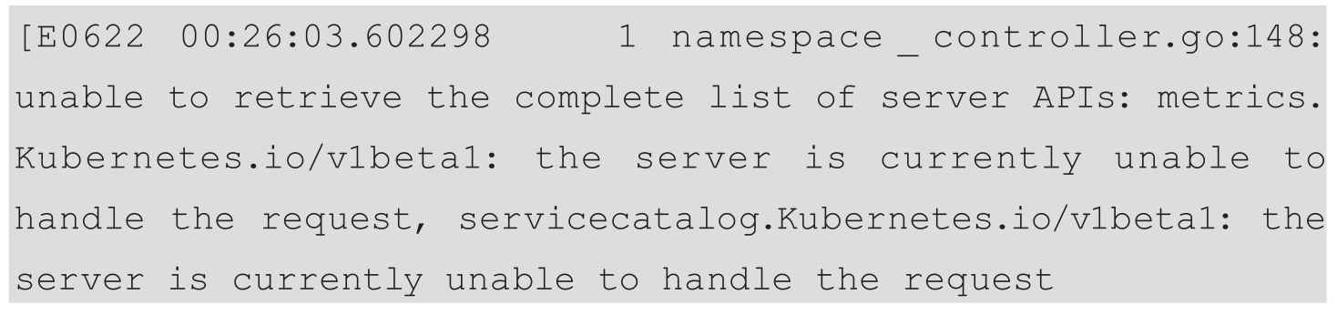 理解了API分组/版本的概念之后,再回头看Kube Controller Manager的日志,就会豁然开朗。显然命名空间的Controller在尝试获取API分组/版本列表,当遇到metrics.Kubernetes.io/v1beta1的时候,查询失败了,并且查询失败的原因是“the server is currently unable to handle the request”。