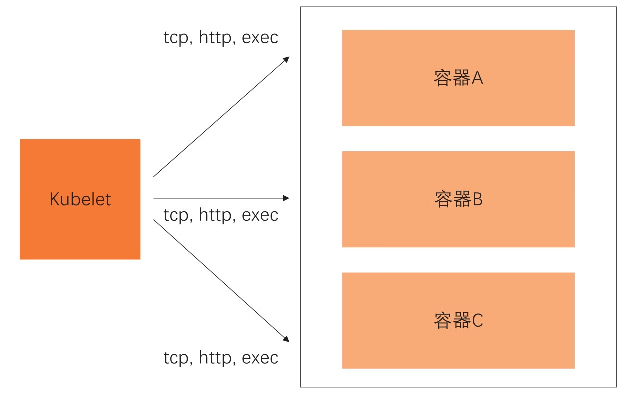 更具体一点,Kubelet作为运行在每个节点上的进程,以tcp/http的方式(从节点网络命名空间到Pod网络命名空间)访问容器定义的接口,或者在容器的命名空间里执行exec定义的命令,来确定容器是否就绪,如图17-1所示。