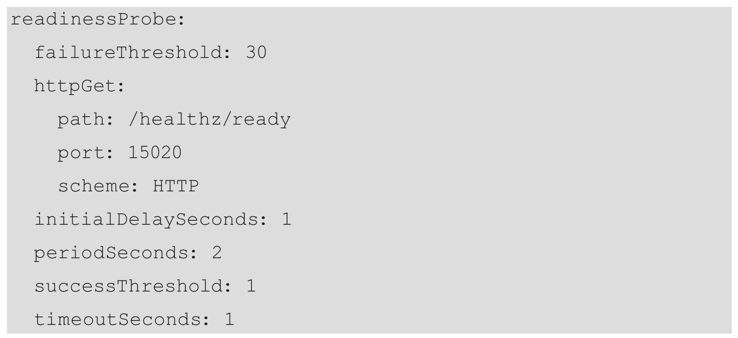 没有通过readiness probe测试的是istio-proxy这个容器。它的readiness probe规则定义如下。