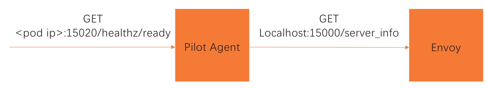 实际上pilot-agent就绪检查接口的实现正是如此,如图17-5所示。这个接口在收到请求之后,会去调用代理Envoy的server_info接口。调用所使用的IP地址是localhost。这非常好理解,因为这是同一个Pod内部进程通信。使用的端口是Envoy的proxyAdminPort,即15000。