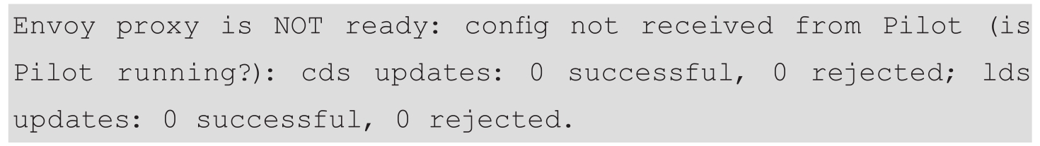 有了以上的知识准备之后,我们来看一下istio-proxy这个容器的日志。实际上,在容器日志里,一直在重复输出一个报错。这个报错分为两部分,其中Envoy proxy is NOT ready部分是pilot agent在响应healthz/ready接口的时候输出的信息,即Envoy代理没有就绪;而剩下的config not received from Pilot (is Pilot running?):cds updates:0 successful, 0 rejected;lds updates:0 successful, 0 rejected这部分,是pilot-agent通过proxyAdminPort访问server_info的时候带回的信息,看来Envoy没有办法从Pilot获取配置。