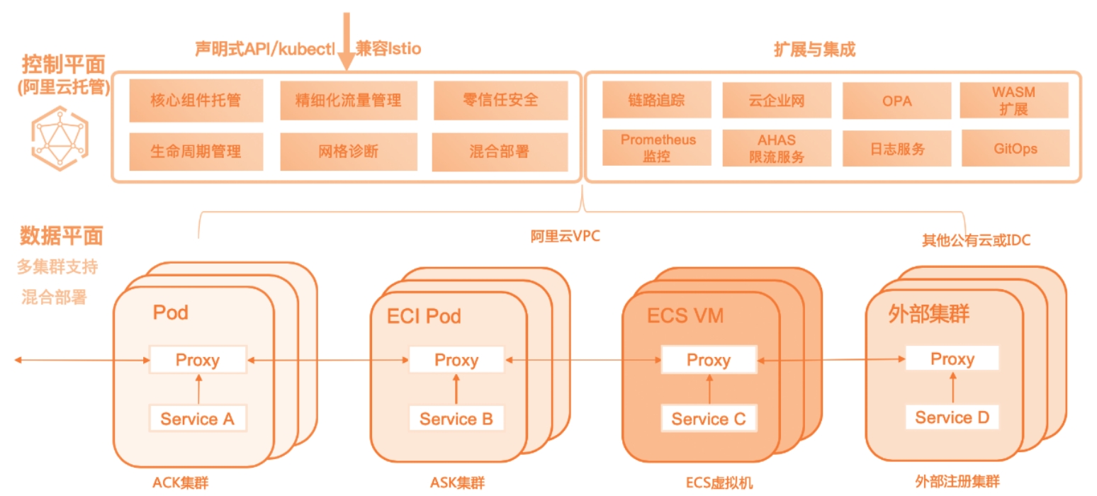 从能力上来看,一个托管了控制平面的ASM实例可以支持来自多个Kubernetes集群的应用服务或者运行于ECI Pod上的应用服务。也可以把一些非Kubernetes服务(例如运行于虚拟机或物理裸机中的服务)集成到同一个服务网格中。