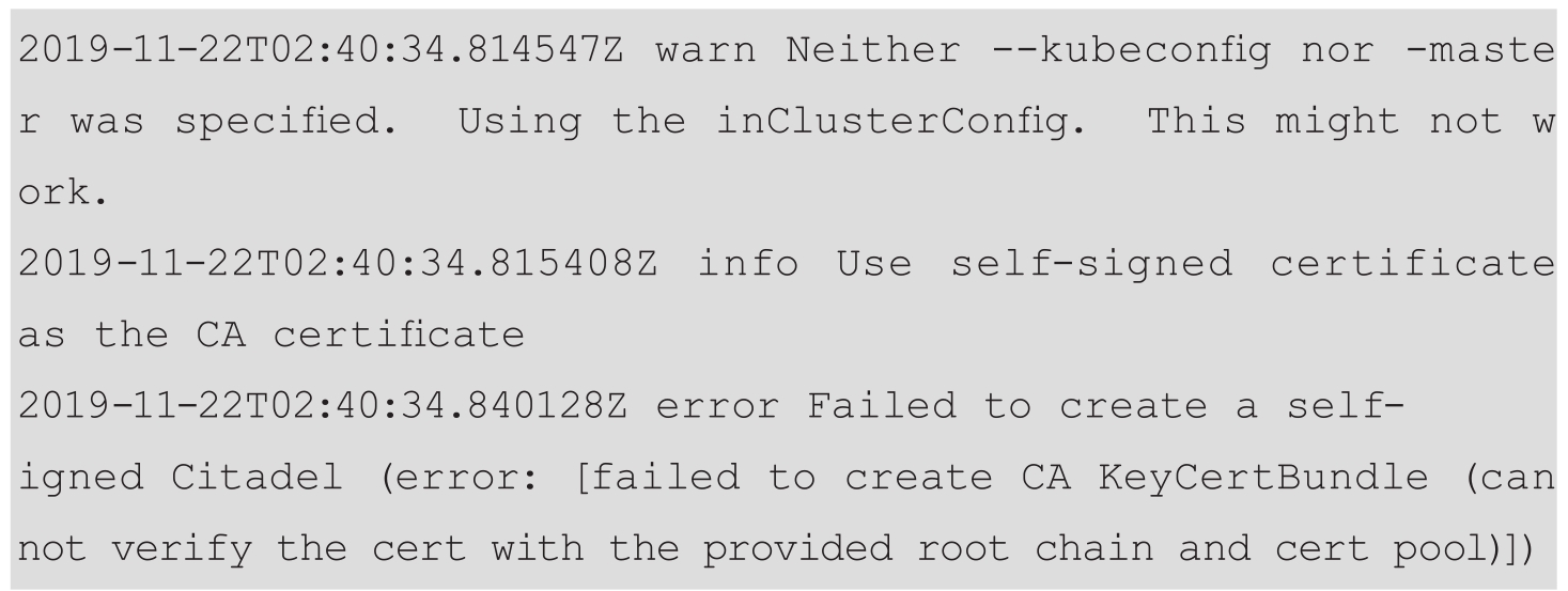 在处理问题之始,我们观察到的第一个现象是,Citadel再也无法启动了。这直接导致集群无法创建新的虚拟服务和Pod实例。观察Citadel,发现其连续重启,并输出以下报错信息。