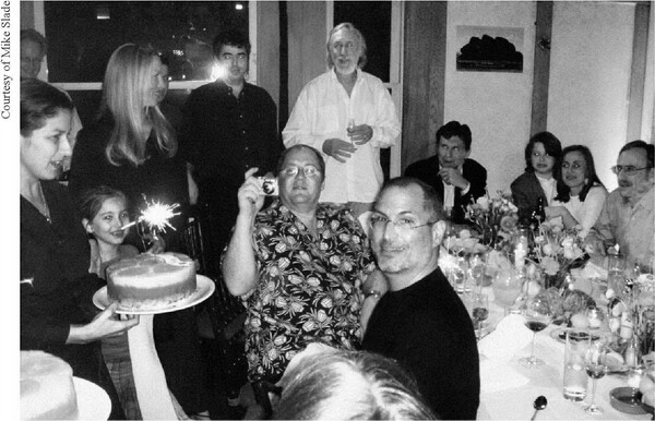 在乔布斯50岁生日派对上,劳伦·鲍威尔搂着伊芙(蛋糕后),还有埃迪·库埃(窗边),约翰·拉塞特(拿相机的),以及李·克劳(留着胡子的)
