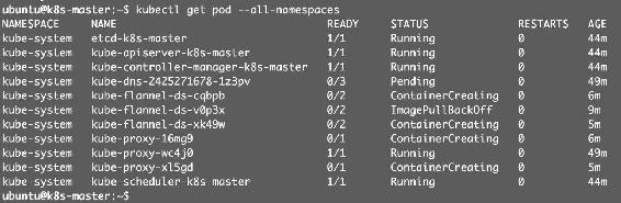 目前所有节点都是NotReady,这是因为每个节点都需要启动若干组件,这些组件都是在Pod中运行,需要首先从Google下载镜像。我们可以通过如下命令查看Pod的状态,如图3-7所示。