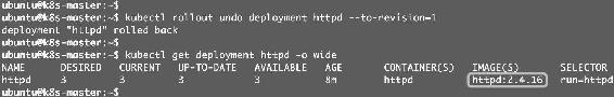 CHANGE-CAUSE就是--record的结果。如果要回滚到某个版本,比如revision 1,可以执行命令kubectl rollout undo deployment httpd --to-revision=1,如图7-10所示。