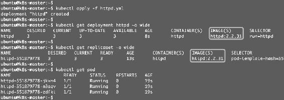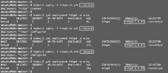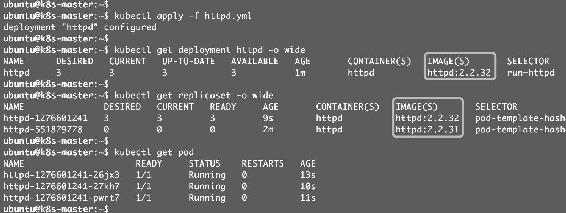 将配置文件中的httpd:2.2.31替换为httpd:2.2.32,再次执行kubectl apply,如图7-3所示。