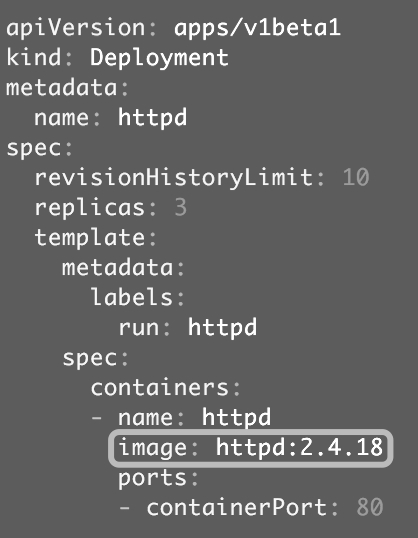 kubectl apply每次更新应用时,Kubernetes都会记录下当前的配置,保存为一个revision(版次),这样就可以回滚到某个特定revision。