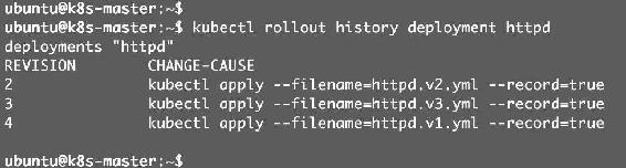revison 1变成了revison 4。不过我们可以通过CHANGE-CAUSE知道每个revison的具体含义,所以一定要在执行kubectl apply时加上--record参数。