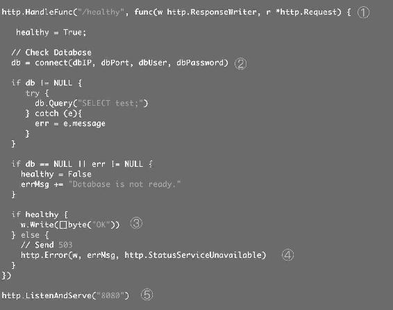 对于http://[container_ip]:8080/healthy,应用则可以实现自己的判断逻辑,比如检查所依赖的数据库是否就绪,示例代码如图8-13所示。