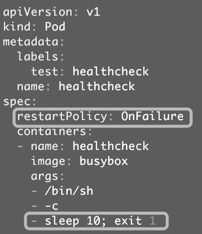 sleep 10; exit 1模拟容器启动10秒后发生故障。