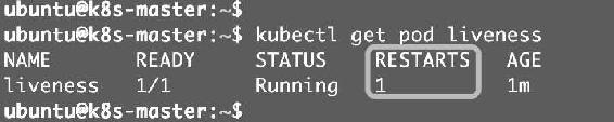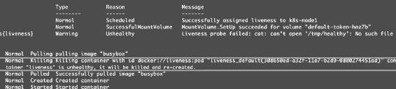35秒之后,日志会显示/tmp/healthy已经不存在,Liveness探测失败。再过几十秒,几次探测都失败后,容器会被重启,如图8-7、图8-8所示。