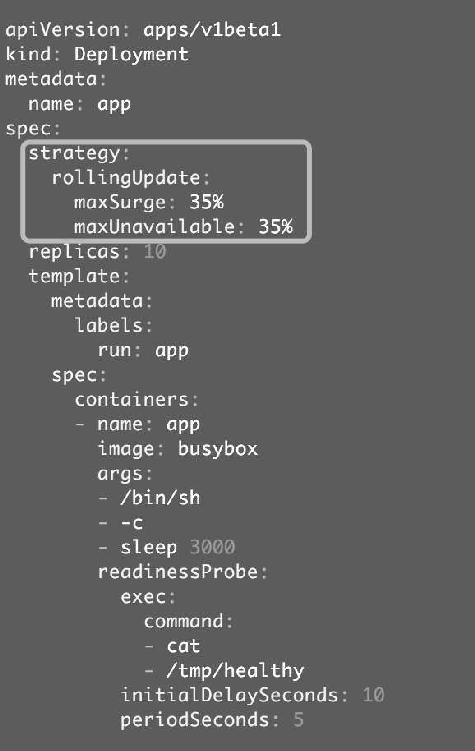 在上面的例子中,DESIRED为10,那么可用的副本数至少要为10 - roundDown(10 * 25%)= 8,所以我们看到AVAILABLE是8。