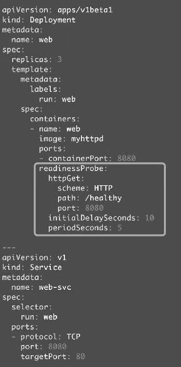 重点关注readinessProbe部分。这里我们使用了不同于exec的另一种探测方法httpGet。Kubernetes对于该方法探测成功的判断条件是http请求的返回代码在200~400之间。