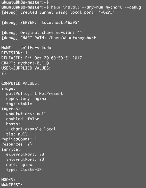 同样,mychart目录作为参数传递给helm install --dry-run --debug。