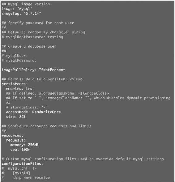 (1)指定自己的values文件。通常的做法是首先通过helm inspect values mysql >myvalues.yaml生成values文件,然后设置mysqlRootPassword,最后执行helm install--values=myvalues.yaml mysql。