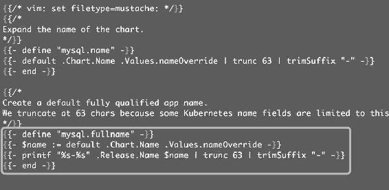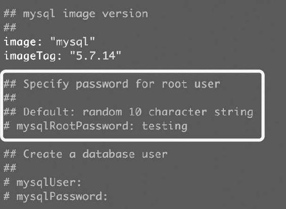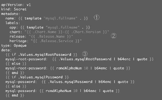 Values也是预定义的对象,代表的是values.yaml文件。.Values.mysqlRootPassword则是values.yaml中定义的mysqlRootPassword参数,如图11-28所示。