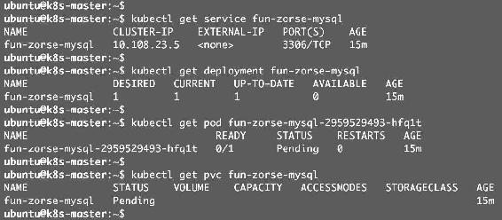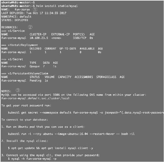 ② 当前release包含的资源:Service、Deployment、Secret和PersistentVolumeClaim,其名字都是fun-zorse-mysql,命名的格式为ReleasName-ChartName。