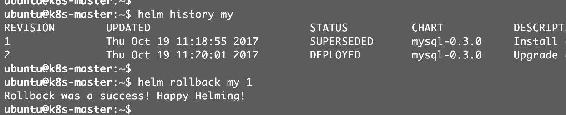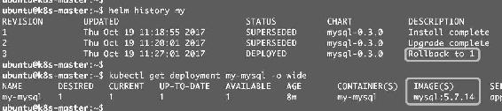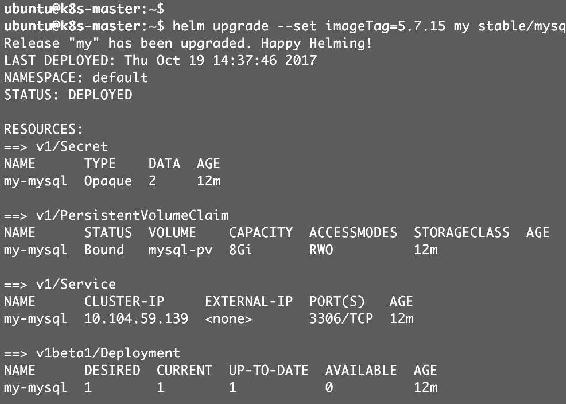 release发布后可以执行helm upgrade对其进行升级,通过--values或--set应用新的配置。比如将当前的MySQL版本升级到5.7.15,如图11-35所示。