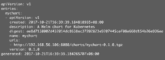 Helm会扫描myrepo目录中的所有tgz包并生成index.yaml。--url指定的是新仓库的访问路径。新生成的index.yaml记录了当前仓库中所有chart的信息,如图11-50所示。