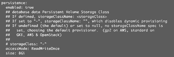 输出的实际上是values.yaml的内容。阅读注释就可以知道MySQL chart支持哪些参数,安装之前需要做哪些准备。其中有一部分是关于存储的,如图11-30所示。