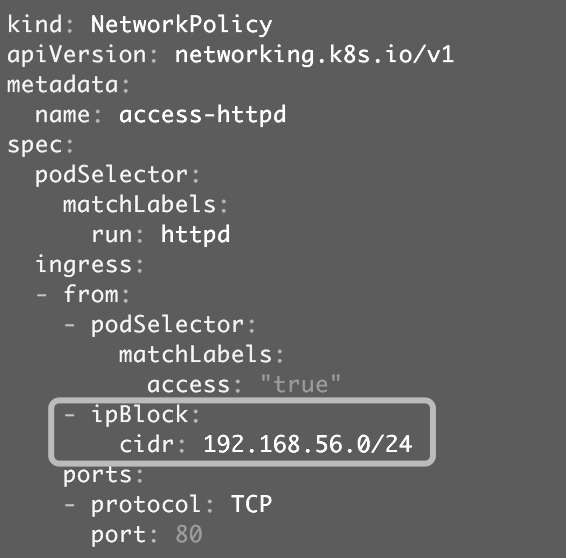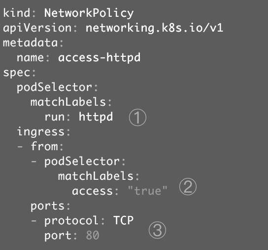 ① 定义将此Network Policy中的访问规则应用于label为run: httpd的Pod,即httpd应用的三个副本Pod。