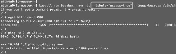 如果Pod添加了label access: "true"就能访问到应用,但Ping已经被禁止,如图12-12所示。