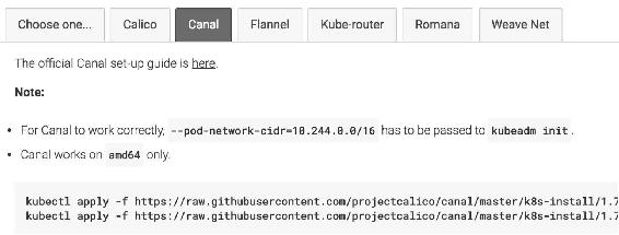 然后按照文档https://kubernetes.io/docs/setup/independent/create-cluster-kubeadm/安装Canal。文档列出了各种网络方案的安装方法,如图12-2所示。